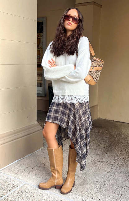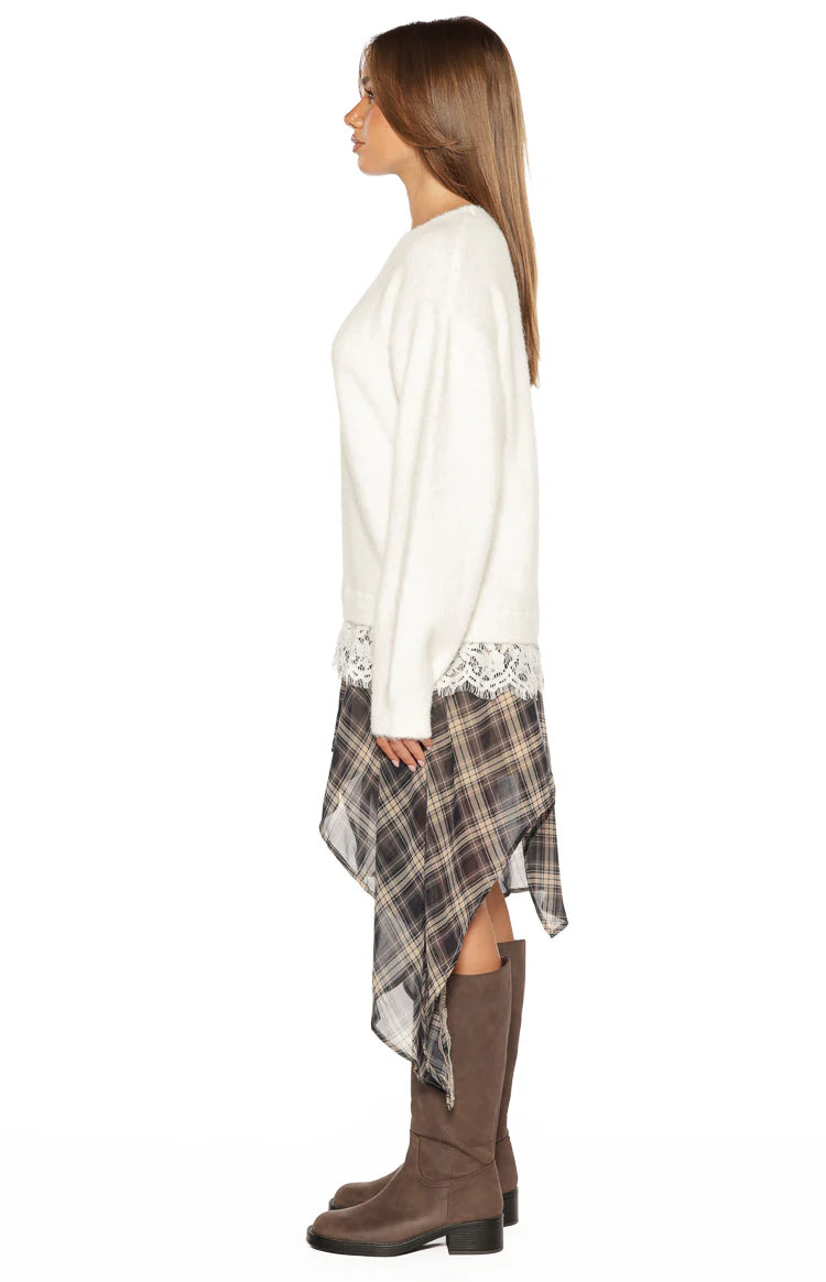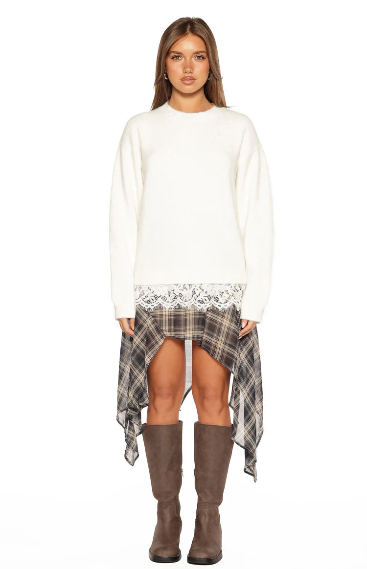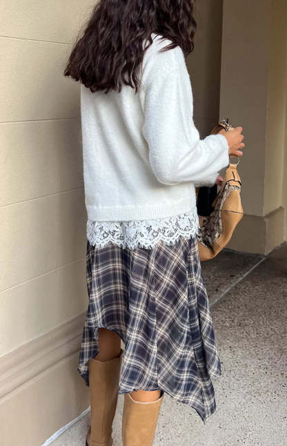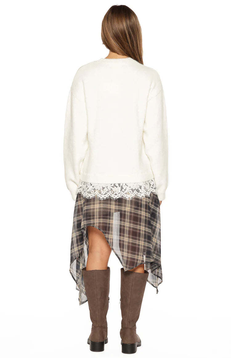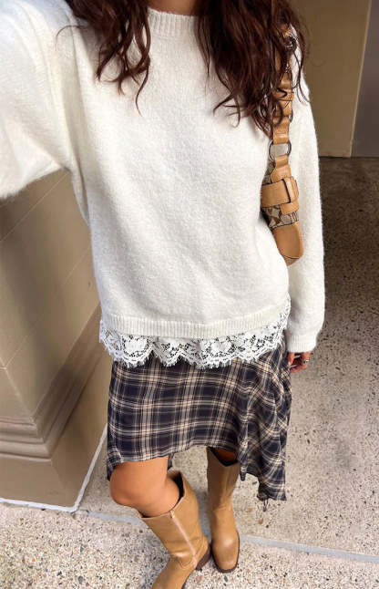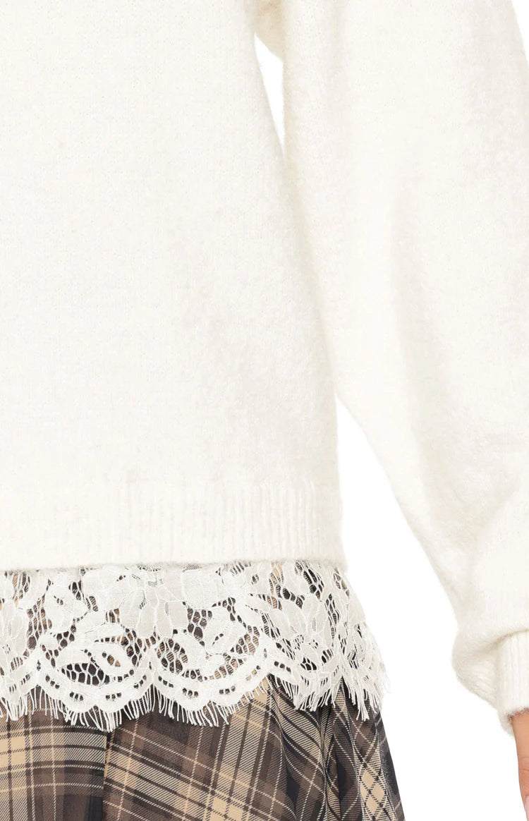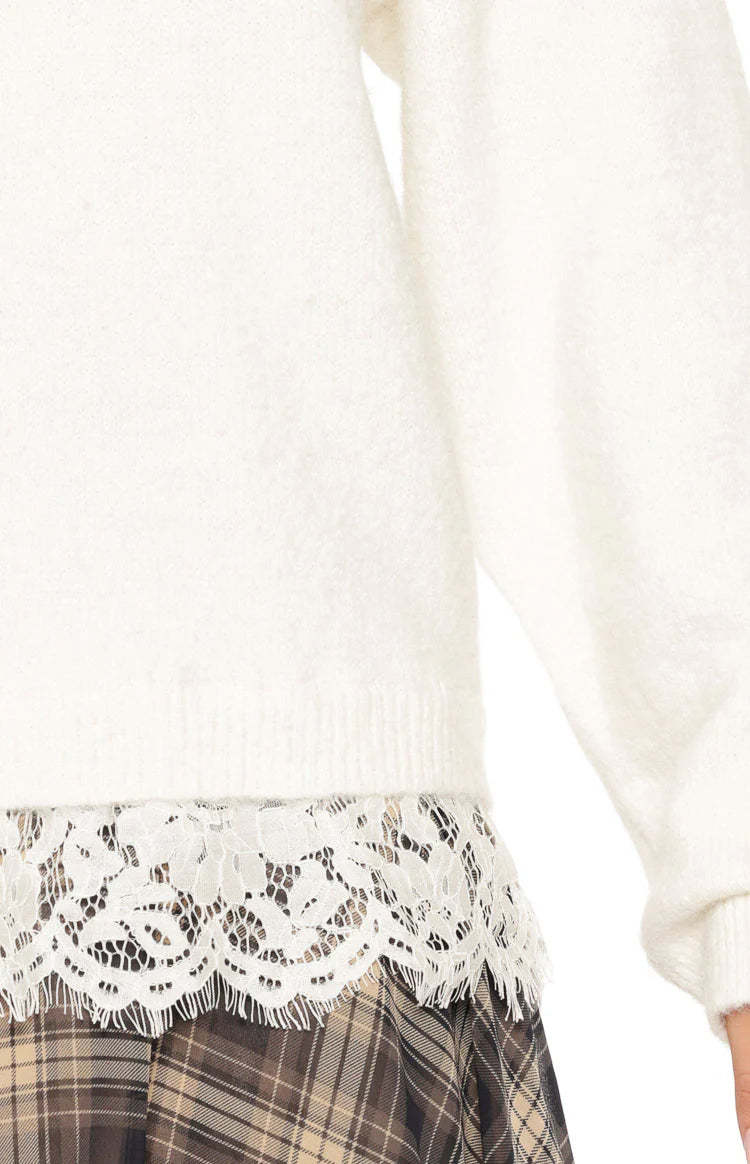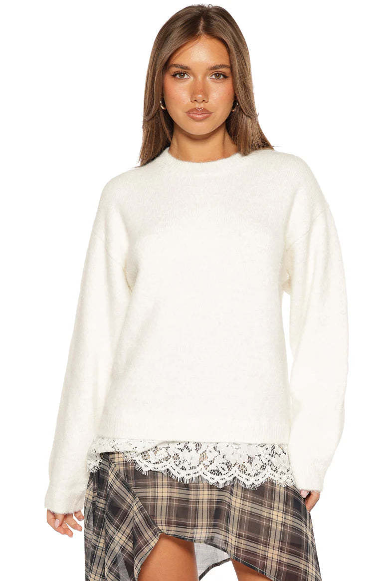 Designed for easy style and ultimate comfort, meet our Lolly Cream Lace Trim Knit, the perfect base piece for your autumn and winter wardrobe. This fitted silhouette is crafted from a ribbed knit material, highlighting long sleeves and a delicate lace trim detailing along the V-neckline. Layer it under a faux fur jacket with denim for a sweet, transeasonal cool-girl look.