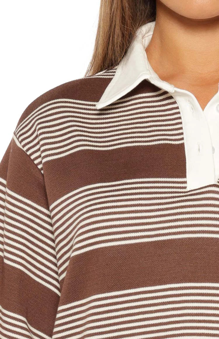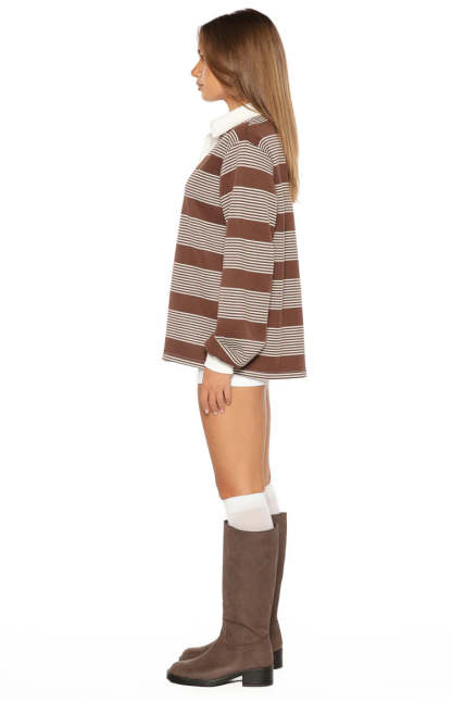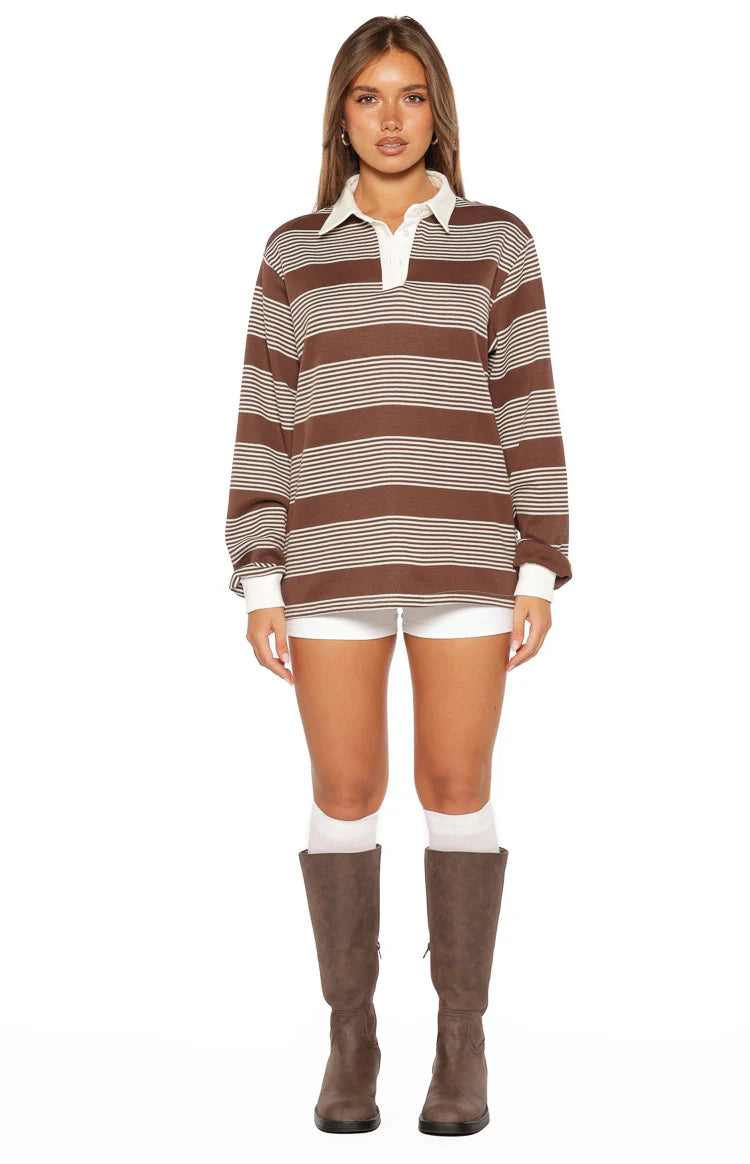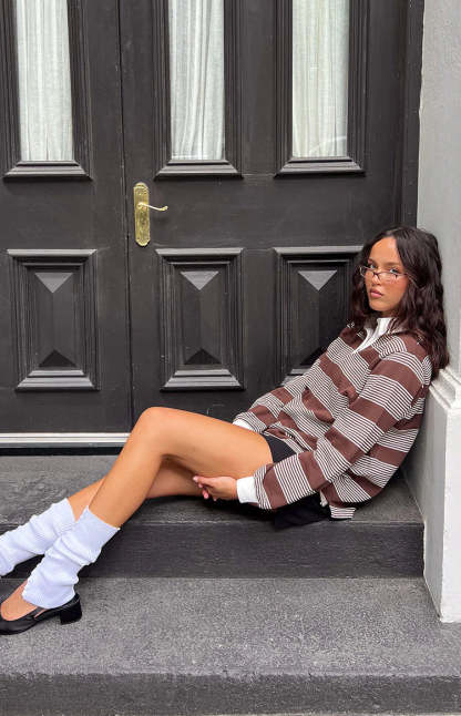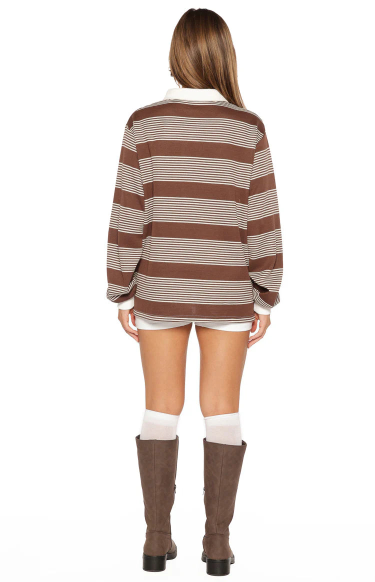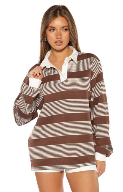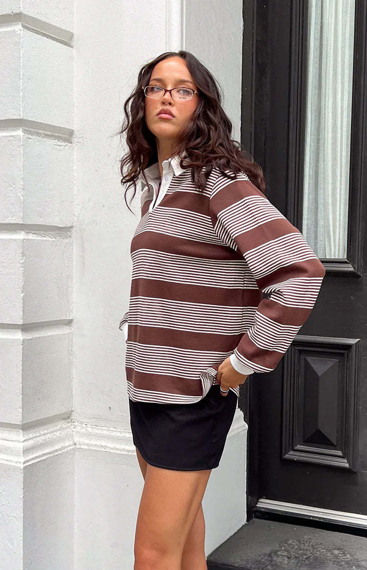 Casual vibes with a twist! Say hello to our Mirabelle Brown Stripe Polo, your new favourite go-to for relaxed autumn days and crisp winter weekends. Cut from a knit material, this piece highlights a collared polo neckline with an open V-neck placket and a brown and cream striped pattern. Pair it seamlessly with your favourite denim and sneakers for an easy, put-together transeasonal look.