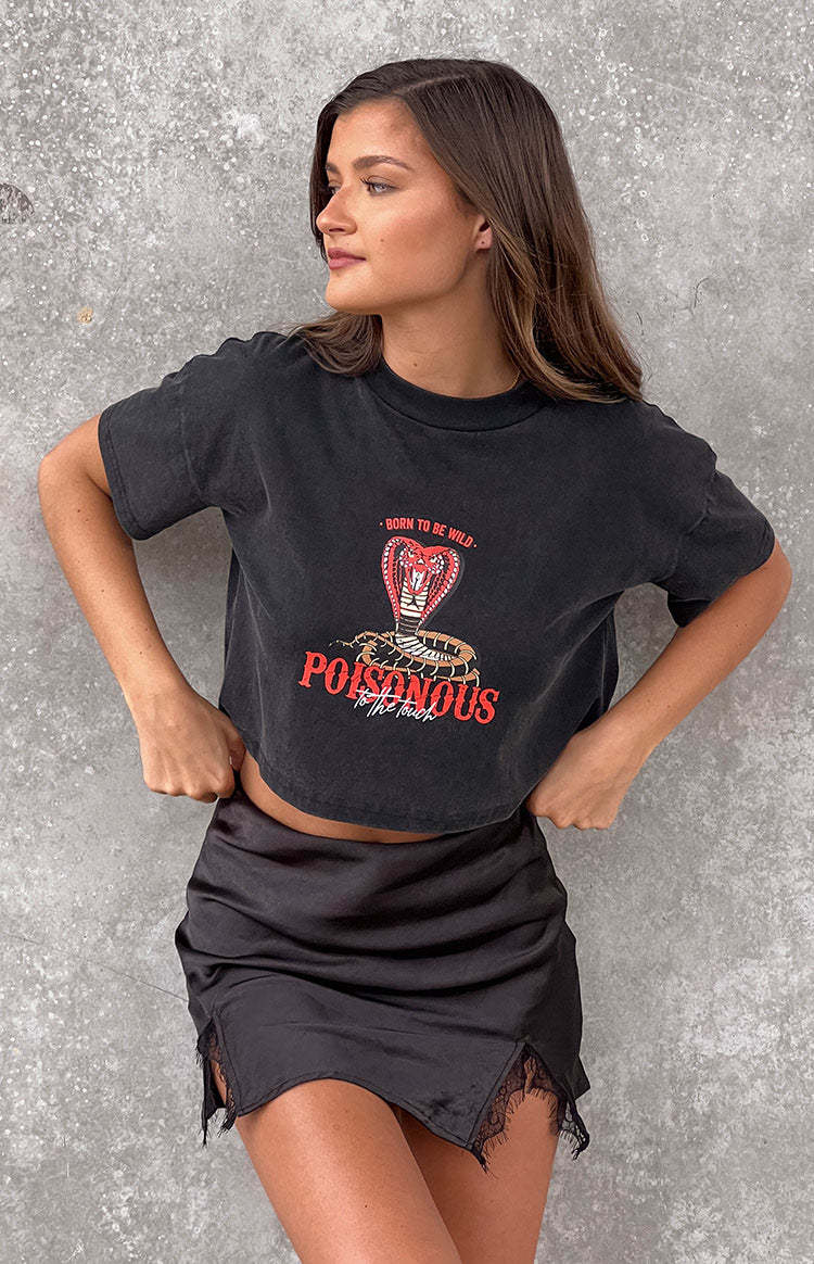 Channel your inner rebel with our Born Wild Tee! Featuring a bold snake graphic and a laid-back cropped fit, this tee is all about attitude. Pair with high-waisted and boots for an effortless street style look, or throw it over a slip dress for that cool, tomboy vibe. Finish your look with a black shoulder and gold to tie it all together!