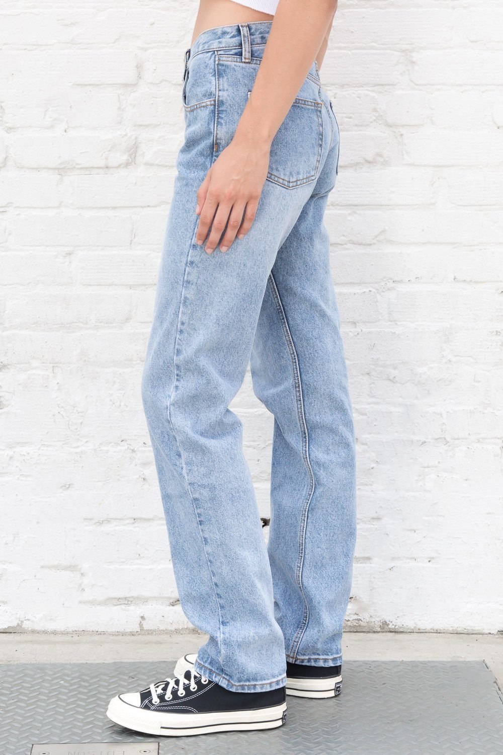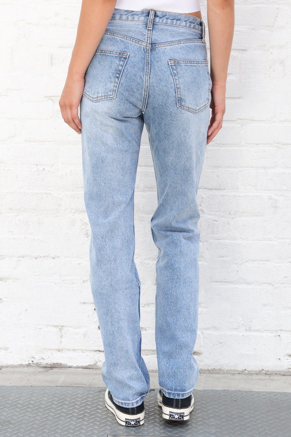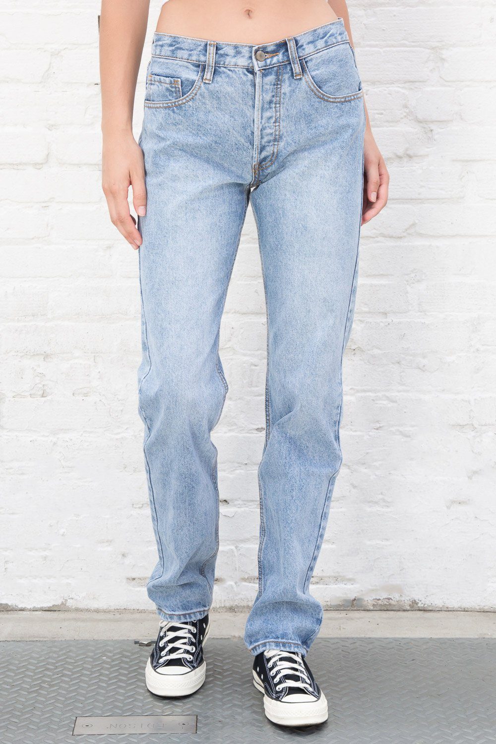 Mid rise light wash straight leg relaxed fit jeans with brown stitching, 5 pockets, belt loops, and a five button closure.