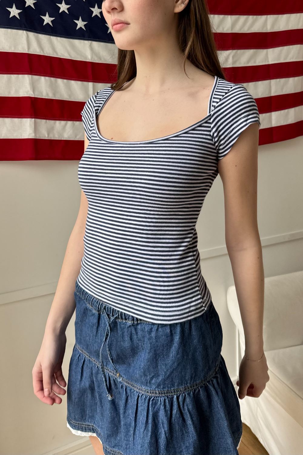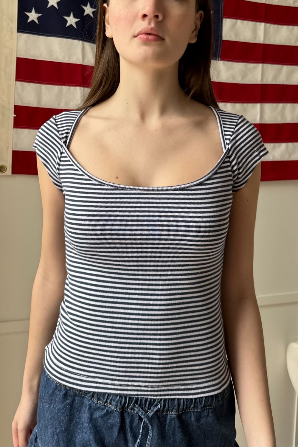 Black and white striped top with a wide square neckline and short sleeves. Fabrics: 96% cotton 4% spandexMeasurements: 18" (46.5 cm) length, 14" (36 cm) bustMade in: China
