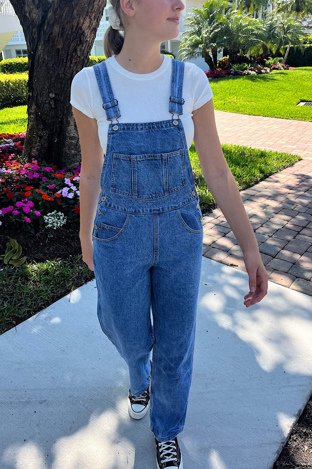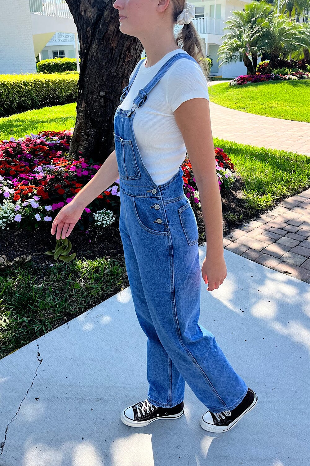 Relaxed fit overalls with two back and side pockets, three front chest pockets, belt loops, adjustable straps, and silver hardware.