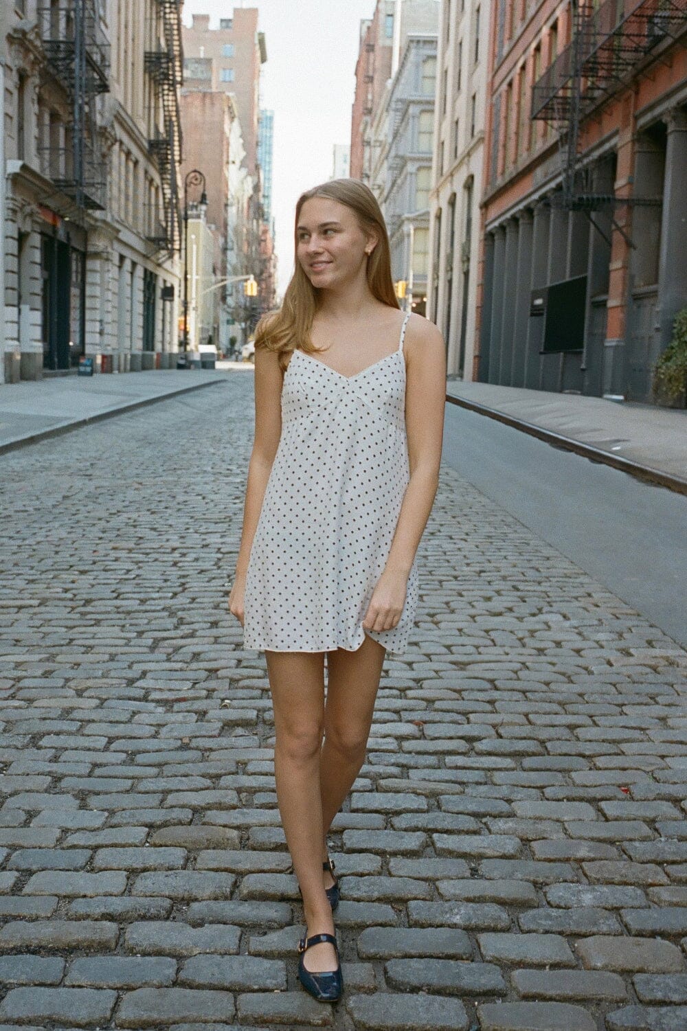 White spaghetti strap dress with navy polka dots, a sweetheart neckline, and softly pleated bust detail.Fabrics: 100% cottonMeasurement: 29" (74cm) length, 28" (71cm) bustMade in: Italy