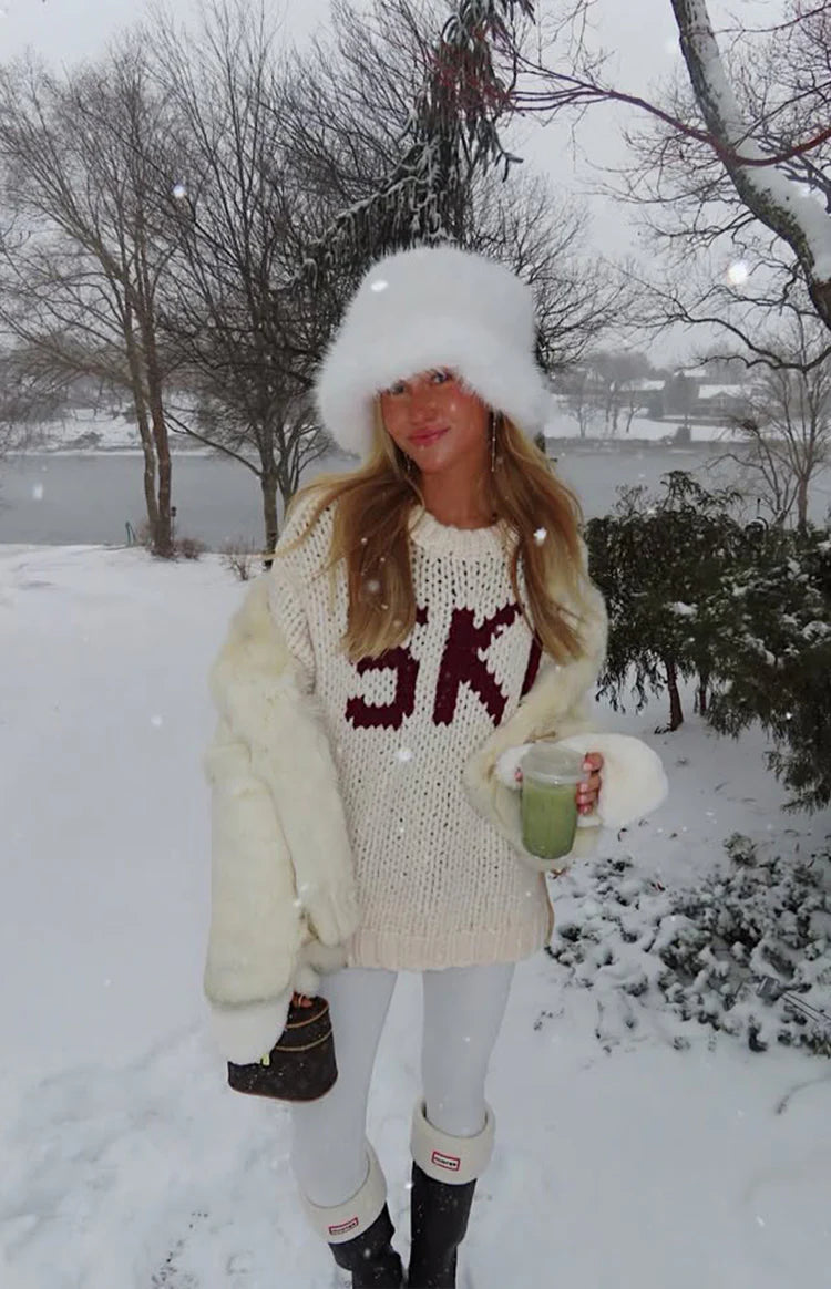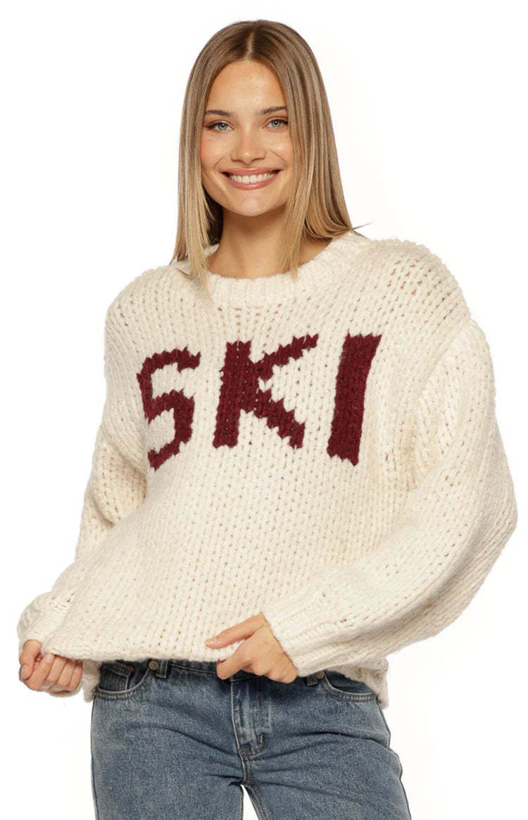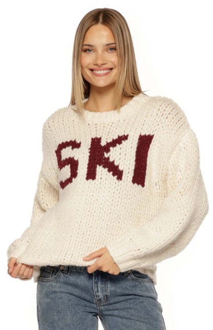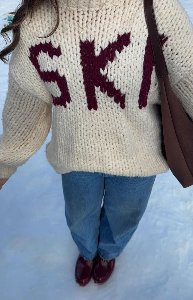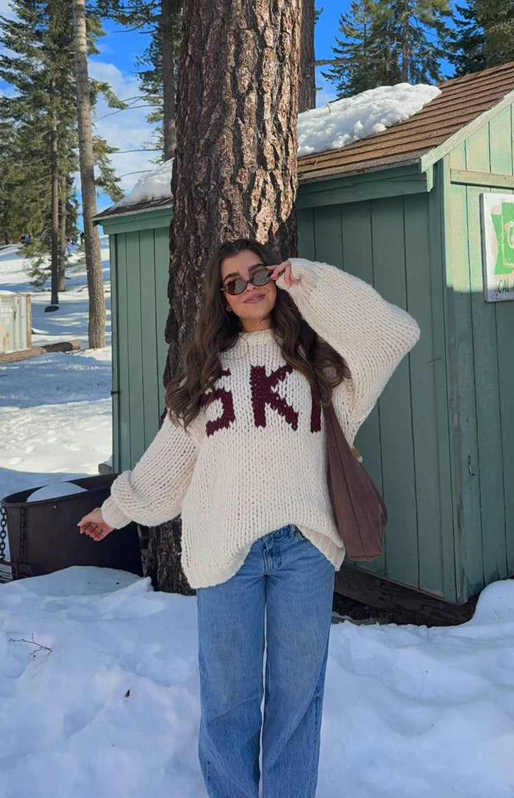 An essential layer for your cozy-season wardrobe, our Jasmine Cream Jacquard Sweater is perfect for an après-ski vibe. Crafted from a soft, chunky knit, this features a relaxed oversized fit and bold "SKI" lettering on the front. Pair it with leggings and for a perfect look or for lounging at home!