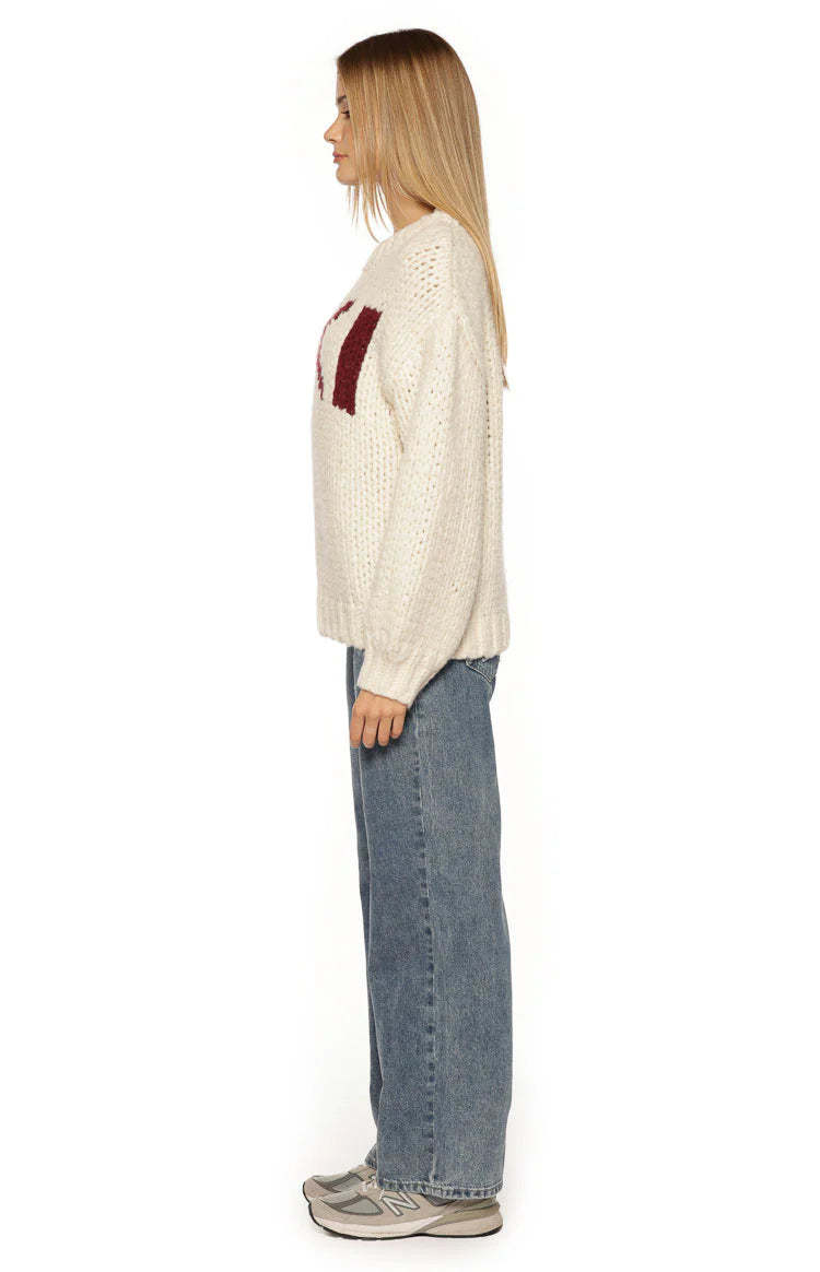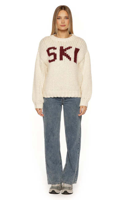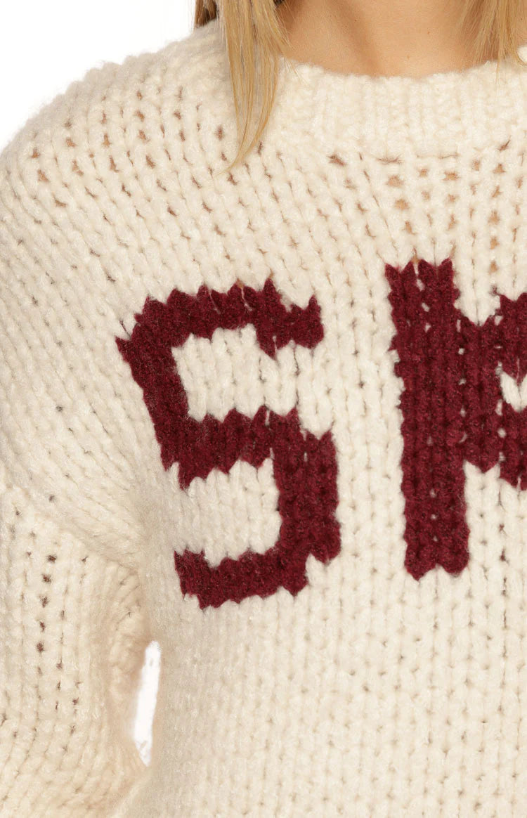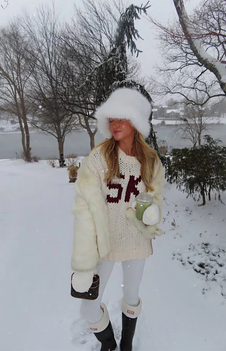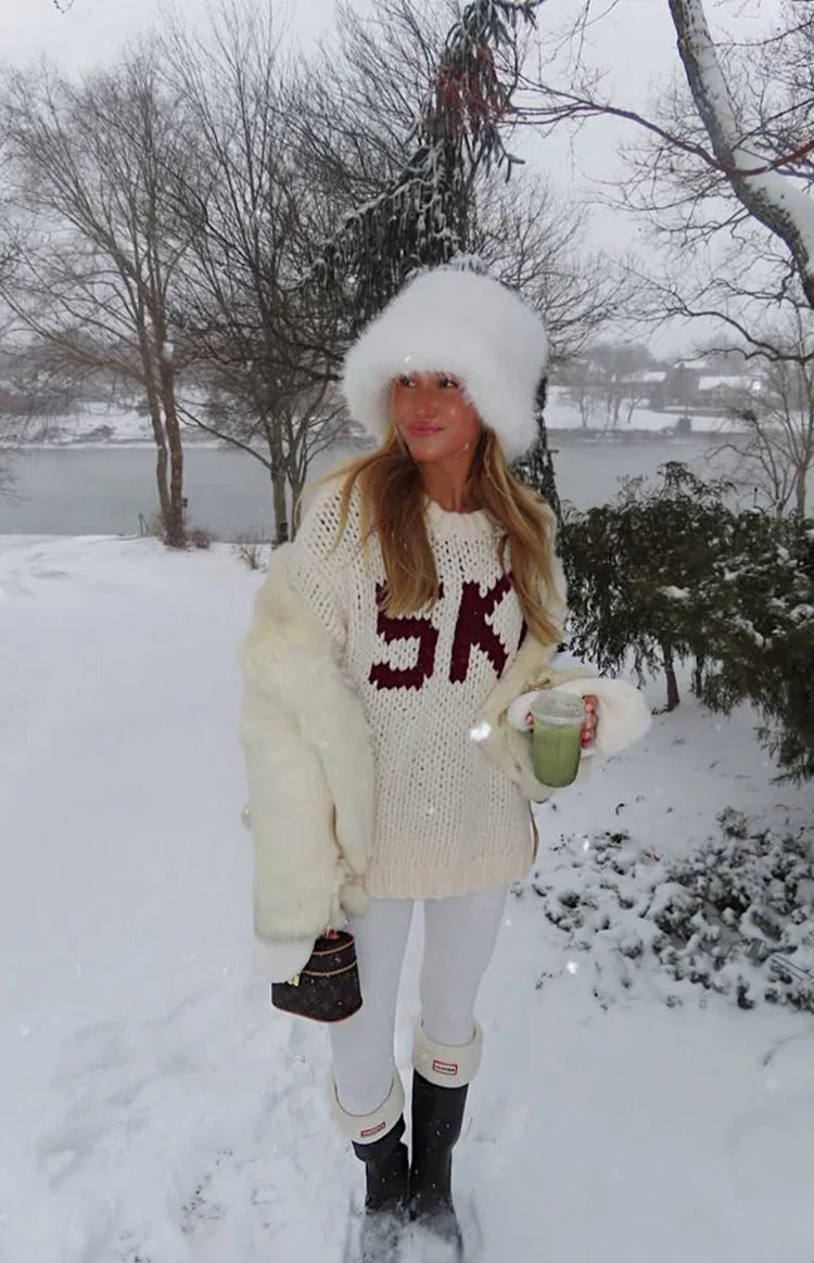 An essential layer for your cozy-season wardrobe, our Jasmine Cream Jacquard Sweater is perfect for an après-ski vibe. Crafted from a soft, chunky knit, this features a relaxed oversized fit and bold "SKI" lettering on the front. Pair it with leggings and for a perfect look or for lounging at home!