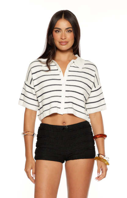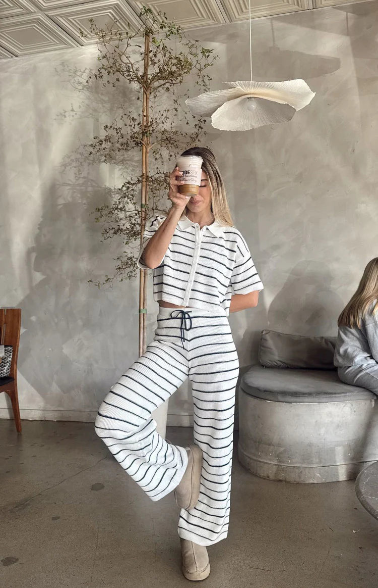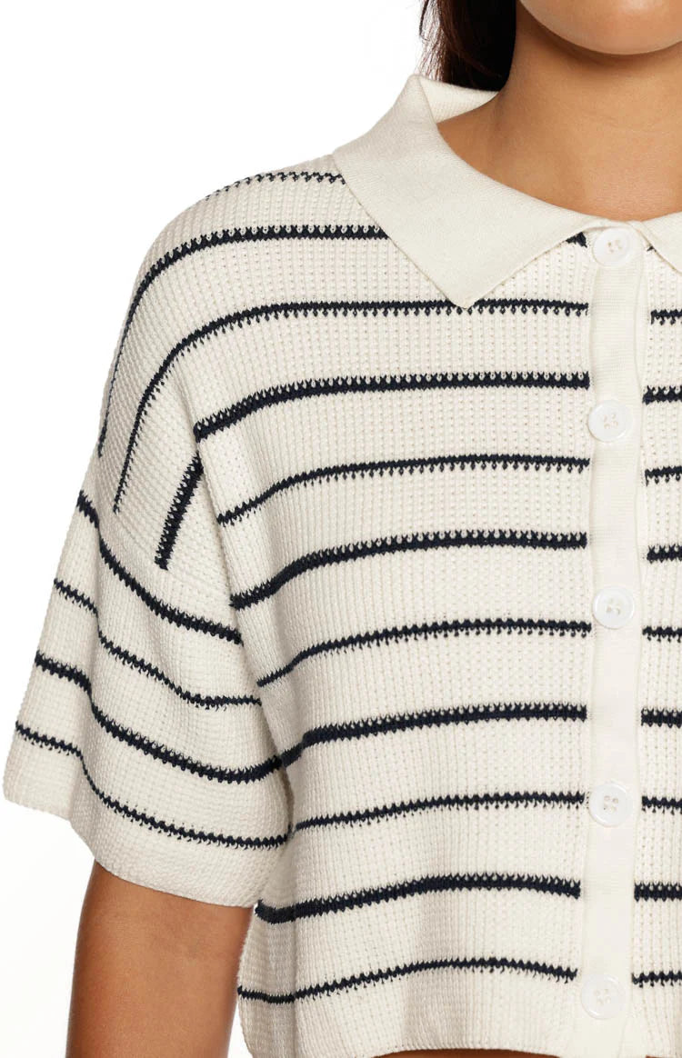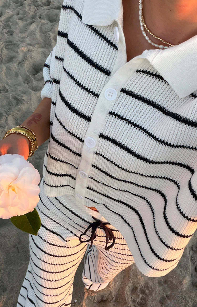 The perfect blend of preppy and polished, our Maple White Navy Stripe Cropped Knit Sweater is your new go-to for elevated looks. Crafted from a soft striped knit, this piece features a classic collar and functioning buttons, offering a versatile silhouette that can be worn open or closed. Create a stunning co-ord by pairing it with the matching Maple Knit and your favourite for a refined, off-duty ensemble.