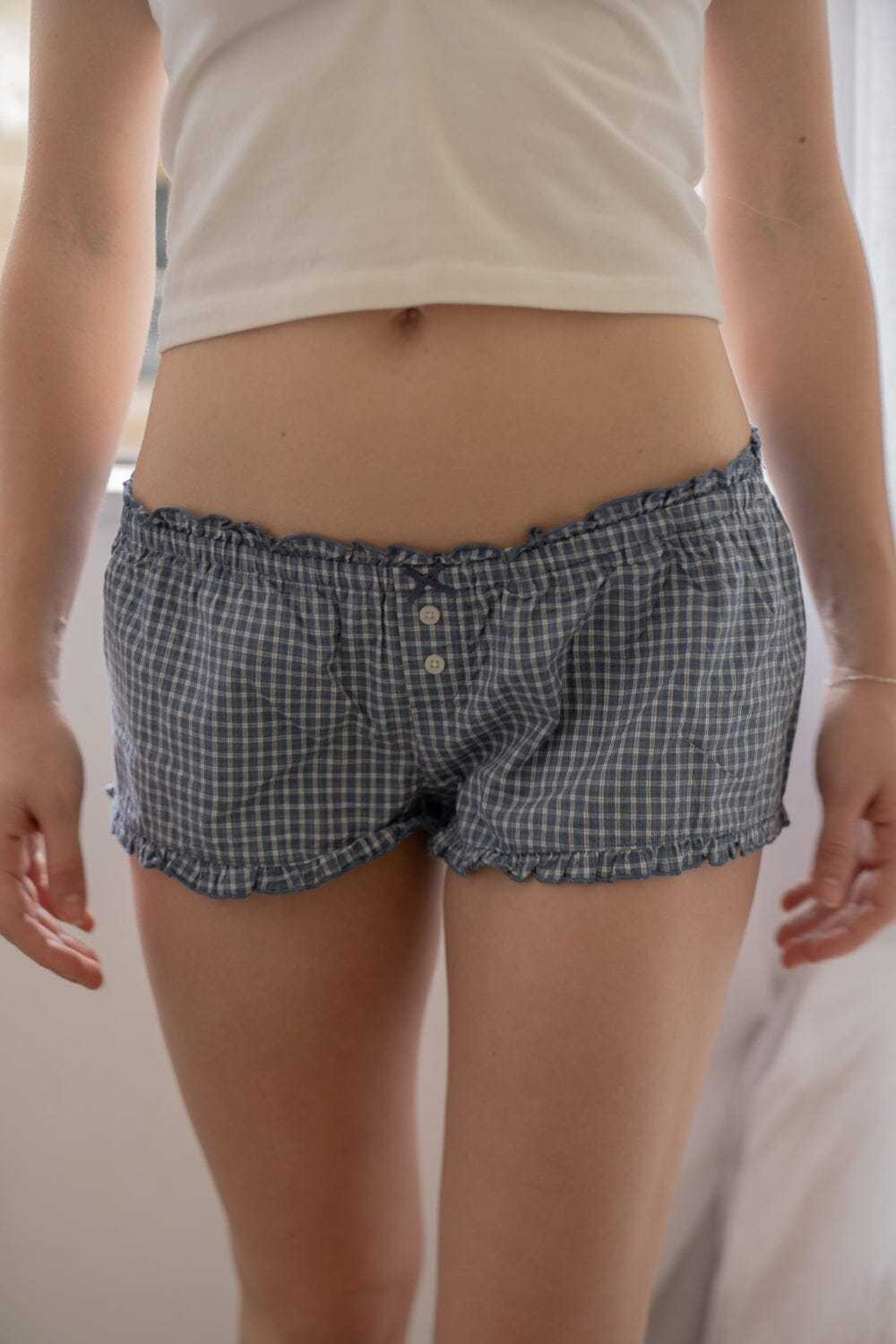Blue with white plaid shorts with buttons and ruffles.Fabrics: 100% cottonMeasurement: 8" (20cm) length, 15" (38cm) waist, 2" (5cm) inseamMade in: China